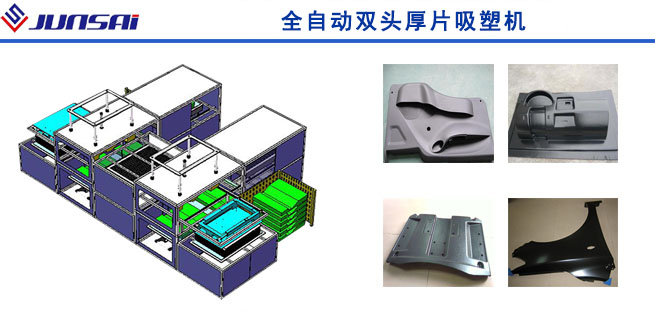 全自動(dòng)雙頭厚片吸塑機(jī)是由上海駿精賽自主研發(fā)的大型雙工位厚板真空吸塑設(shè)備,主要用于汽車內(nèi)飾等大型板材厚吸塑件加工成型。這臺(tái)機(jī)器有兩個(gè)吸塑工位、兩個(gè)上料工位、一個(gè)加熱爐、兩種加熱模式:自動(dòng)上料和手動(dòng)上料。